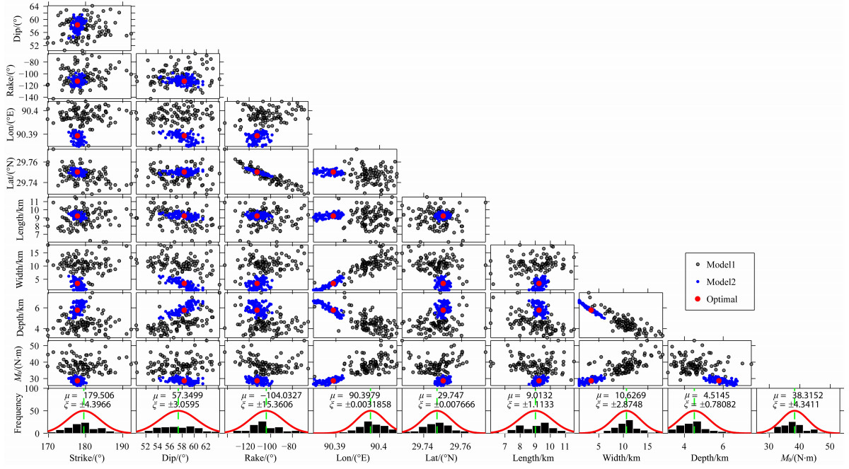 图 3 断层模型参数折中和不确定性分布图 灰色点和蓝点分别表示Model1和Model2模式对应的反演结果;红点为未添加模拟噪声并使用Ckl(h)加权情况下得到的结果;μ为参数高斯分布的中值;ζ为在95%置信水平下的标准偏差. Fig. 3 Uncertainty and trade-offs of the model parameters Gray points and blue points are the inversion results of Model1 and Model2, respectively; red dots are the ones inverted with the actual InSAR measurements weighted by Ckl(h).μ is the median value of the Gaussian distribution and ζ refers to the standard deviation at the level of 95% confidence. |