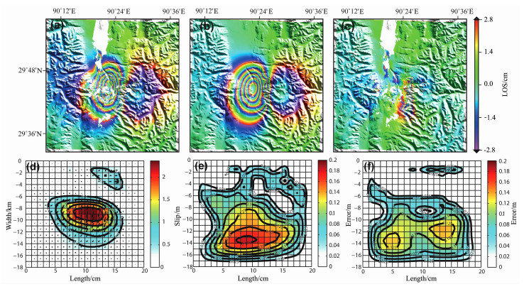 图 4 InSAR观测、滑动分布模型及不确定性 (a)InSAR同震位移场;(b)模拟InSAR位移场;(c)观测位移与预测位移之间的残差;(d)空间滑动分布,黑色箭头表示滑动方向;(e)走向方向上滑动量的不确定性;(f)倾向方向上滑动量不确定性. Fig. 4 InSAR observations, distributed-slip model and slip uncertainty (a) Observed coseismic interferogram; (b) Modeled coseismic displacement; (c) Residual interferogram ((a)-(b)); (d) Distributed-slip model, where the arrows indicate slip directions; (e) Uncertainties in the strike slips; (f) Uncertainties in the dip slips. |