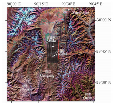 图 5 2008年当雄地震发震构造ETM+解译图 白框为均匀断层模型在地表的投影;黑线格为空间滑动分布模型在地表的投影;红线为空间滑动模型与地表的交线. Fig. 5 The ETM+ image of the seismogenic structure of the 2008 Damxung Earthquake The white rectangle indicates the uniform model projected on the ground surface; the black net indicates the DSM projected on ground surface; the red line represents the intersection of the DSM with the ground surface. |