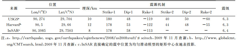 表 1 2008年10月6日当雄MW6.3地震震源机制 Table 1 Focal mechanisms of the October 6th 2008 Damxung Earthquake |