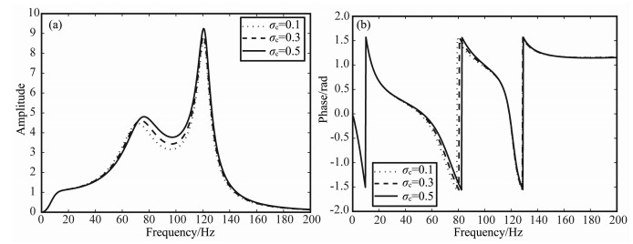 图 3B 耦合介质的泊松比变化时检波器-灰岩耦合系统的幅频响应(a)和相频响应(b) Fig. 3B The geophone-limestone coupling system′s amplitude response (a) and phase response (b) for the change of the coupling medium′s Poisson Ratio |