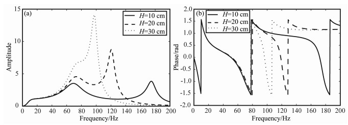 图 3E 耦合介质的高度变化时检波器-灰岩耦合系统的幅频响应(a)和相频响应(b) Fig. 3E The geophone-limestone coupling system′s amplitude response (a) and phase response (b) for the change of the coupling medium′s height |