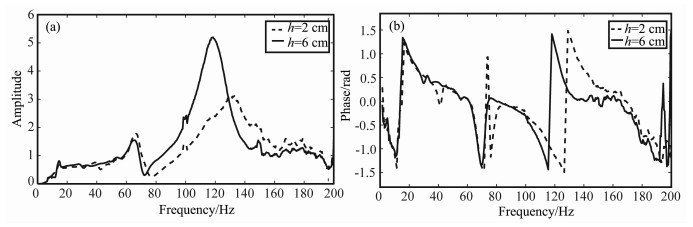 图 8 检波器尾锥高度变化时检波器-灰岩耦合系统响应的振动台测试结果 (a)幅频响应;(b)相频响应. Fig. 8 Shake table test results of the geophone-limestone coupling system response for the change of the height of the geophone spike (a) Amplitude response; (b) Phase response. |