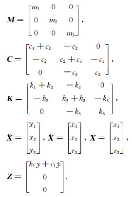 其中,M、C、K分别为“三自由度耦合系统”的质量矩阵、阻尼矩阵和刚度矩阵,Ẍ、Ẋ、X分别为三个质量体的加速度矩阵、速度矩阵和位移矩阵,Z是与地表位移和速度有关的矩阵.而且,