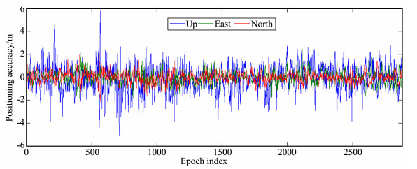 5.2 坐标初值求解及精度分析初值是以伪距观测组合为基础,并结合实时接收到的钟差的近似解来估计坐标参数的值.由于伪距观测值精度较低,所以以其观测组合求解的坐标参数的精度相对较低,但其可作为相位观测解算的初值.实时PPP解算过程中伪距观测组合模型的估计结果划归为以同济大学基准站为中心的站心坐标系(NEU),其结果见图 3.从图 3可以看到,伪距估计值结果在N、E两个方向优于2 m,U方向绝大部分优于2 m,这完全满足相位解算的初值.