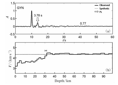 图 13 GYN台的接收函数和反演的S波速度结构 (a)接收函数,P波初至后3.78 s出现莫霍面Ps转换震相;(b)S波速度分布,莫霍面出现在32~34 km深度. Fig. 13 Observed and synthetic receiver function for station GYN (a) P-to-S converted phase from the Moho discontinuity arrives at 3.78 second after the onset; (b) Inversion result for GYN reveals the crust-mantle transition occurs at 30~32 km depth beneath the station. |