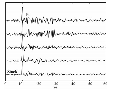 图 4 ANS台4个径向分量接收函数的叠加结果 P波初至之后的3.7 s出现Ps转换波震相. Fig. 4 Radial component receiver functions from 4 teleseismic earthquakes recorded at station ANS and a representative receiver function obtained by stacking Note consistent arrival of Ps at 3.7 second after the initial P wave arrival. |