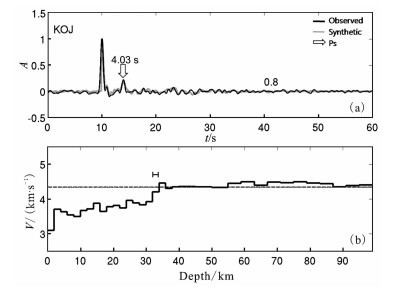 图 8 KOJ台的接收函数和S波速度结构 (a)接收函数,P波初至后4.03 s出现莫霍面Ps转换震相;(b)S波速度分布,莫霍面出现在32~34 km深度. Fig. 8 Observed and synthetic receiver function for station KOJ (a) P-to-S converted phase from the Moho discontinuity arrives at 4.03 second after the onset; (b) Inversion result for KOJ reveals the crust-mantle transition occurs at 32~34 km depth beneath the station. |