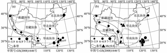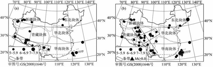 以汶川地震为例,2005年以来大尺度北东向地壳缩短的相对运动明显增强,青藏块体相对华南地块的北东向运动明显增强[12],是否与2006年2月至2008年3月形成的武都至和田长约2200km的北西西向条带(中强地震主要分布在北西西向的巴颜喀拉地块和羌塘地块)有关?2004年12月印尼苏门答腊巨震对中国青藏地块东边界的影响使右旋剪切构造动力作用增强[12, 17],是否与2005年8月至2008年3月形成的普洱至武都长约1200km的北北东向条带有关?两个条带的形成机理值得进一步研究.