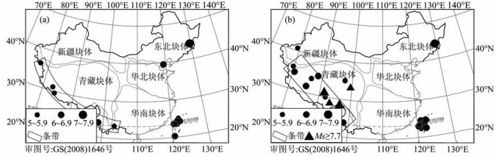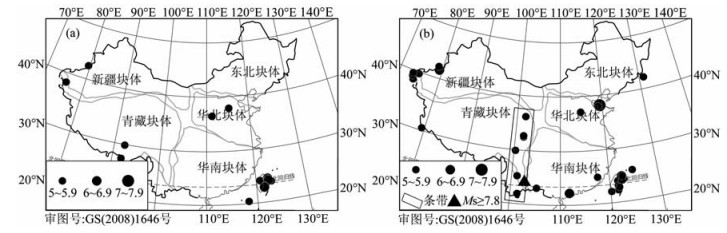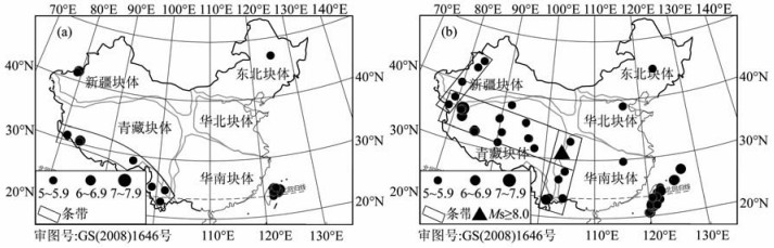 本文研究使用历史地震目录[8, 9]及中国地震台网中心整编的大震速报目录(http://www.csndmc.ac.cn/newweb[2010-04]).文中中强地震泛指Ms5.0~6.9级地震,大震指Ms7.0~7.9级地震,特大地震指Ms8.0级以上地震,文中未标度的震级皆为Ms面波震级.有关历史地震目录完整性对震例研究的影响,将在第5节中给予讨论.