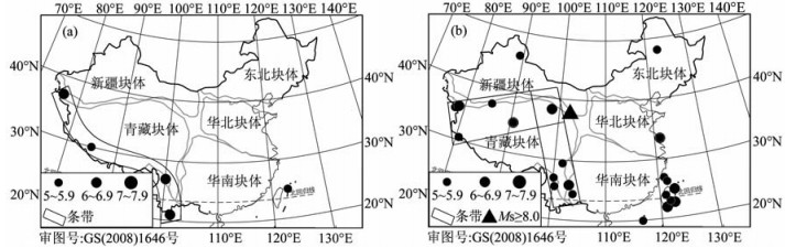 因此,考察1900年以来中国大陆地区其他8级左右地震前是否出现与昆仑山口西8.1级和汶川8.0级地震前相似的中强地震活动图像演化,并探讨6级以上地震条带的出现是否是预测8级左右地震的必要条件,是本研究的主要目的.