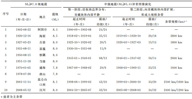 表 1列出1900年以来中国大陆地区发生的10个7.8级以上地震和此前中强地震活动图像的两阶段演化.发现震前出现中强地震两阶段演化现象的震例都分布在青藏块体(包括其周缘地区),如1920年海原8.5级、1927年古浪8.0级、1950年察隅8.6级(包括1951年当雄8.0级,相隔时间近,可算作1组)、2001年昆仑山口西8.1级和2008年汶川8.0级等8级以上地震.1970年通海7.8级地震前的中强地震两阶段演化由于第一阶段持续时间较短、第二阶段条带规模较小等,相对不典型.上述震例都分布在青藏块体,可能与青藏块体正处在印度板块的作用方向上、其中强地震演化可以较好地体现印度板块对青藏块体的作用过程有关.而且境外中强地震缺记仅对演化的第一阶段有部分影响(如影响中强地震沿板块边缘分布的成带性,但对块体边缘活跃、内部平静的现象并无实质影响),对第二阶段(主要反映青藏块体中强地震有序分布)没有影响.
