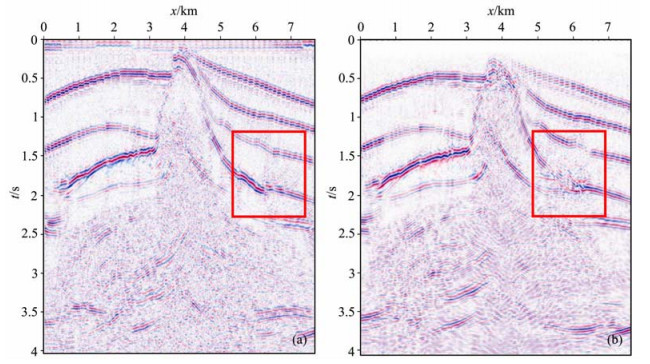 图 5 线90的三维SEG岩丘模型体偏移结果(a)及线偏移结果(b) Fig. 5 The volume Kirchhoff PSTM result of 3D SEG salt model (line 90) (a) and the line target Kirchhoff PSTM result of 3D SEG salt model (line 90) (b) |