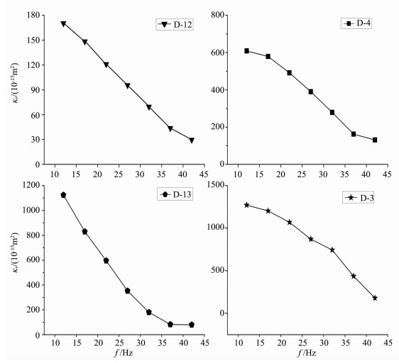 图 5是4块岩样动电渗透率的频率响应特性, 可以看出, 渗透率随频率降低逐渐增大, 这与Johnson[24]给出的动态渗透率变化趋势一致.图 6, 图 7分别是D-2、D-12岩芯动电参数的幅度和相位随频率变化的情况.其中KS的幅度随频率降低而增大, 最后趋于稳定, 但相位却随频率降低而降低, 特别在频率小于22 Hz以后相位几乎为零, 这与文献[25]中KS的理论变化规律相吻合.KE, σr的幅度和相位随频率变化都不大, 电导率σr在测量频带内出现了常相位角现象[5].