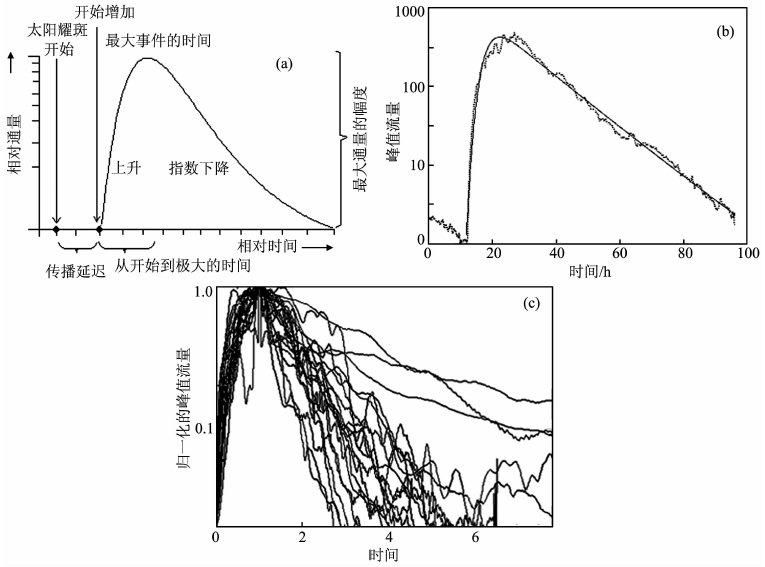 典型的单个缓变型太阳质子事件随时间变化的轮廓如图 1a所示.从图上可以看出,典型的缓变太阳质子事件具有如下特征:从质子被加速到质子通量增强有一个传播延迟时间,通常为20~90min.最初的通量是各向异性的,偏于向前的方向,但逐渐地变为各向同性.质子通量强度快速上升到一个峰值(上升相),然后缓慢地衰减到背景水平(下降相),一般是以指数规律衰减的.通常在10~14h后,可下降到峰值流量的1/e的水平[4].本文即基于对这种典型特征的统计验证,提出了一种预报质子事件流量的思路.