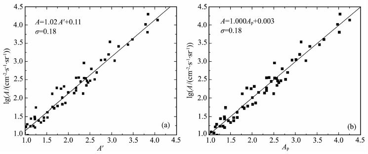 以2005年6月16日事件为例,分别使用质子通量增加后1~100个点的观测值对峰值进行预报.采用连续增加的数据点来拟合通量的变化,可以看出:随着所采用数据的增加,预报值A′由远远高于实测值,到越来越接近实测值;当所采用的数据点继续增多时,又发生预报值比实测值偏低,并趋近于一个恒定值,详见图 2.图中横轴为所采用的数据点数,纵轴为质子流量实测值的常用对数值.其他事例也给出类似的结果.