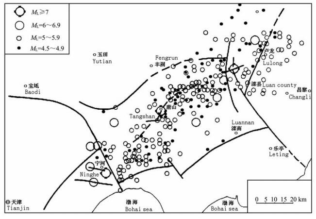 图 7 唐山7.8级地震和强余震分布图(1976-07-28~1976-12-23)[1] Fig. 7 Distribution map of Tangshan M7.8 earthquake and its strong aftershocks (1976-07-28~1976-12-23)[1] |
