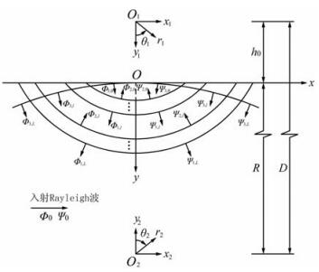 入射Rayleigh波的圆频率为ω,在坐标系x-y下,其势函数为