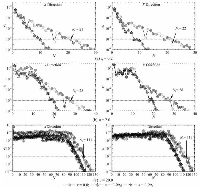 表 1中的谷地V0-1为三层沉积谷地,考虑该谷地3个地表点位移的收敛性,在坐标系x-y下,这3个点的坐标分别为(0,0)、(4a3,0)、(-4a3,0).在入射Rayleigh波频率η=0.2、2.0和20.0的情况下,由(55)式计算出的这三个点的误差ex,ey与截断项数N之间的关系如图 3所示.可以看出,针对任一空间点,随着截断项数的增加,相邻截断项数之间的误差逐渐减小,当截断项数超过某一数值时,该误差将低于10-6,意味着级数解收敛.入射波频率越高,级数收敛所需项数越多,例如针对谷地地表中心点,即点(0,0),入射波频率η=0.2、2.0和20.0所需的收敛项数依次为22、28和117.此外,不同空间点位移的收敛所需截断项数也有所不同,如图 3所示,谷地中心点(x=0)位移的收敛项数高于谷地之外地表点(x=±4.0a3)位移的收敛项数.