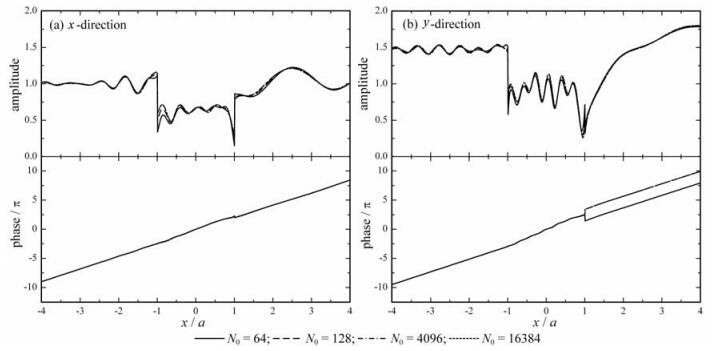 下面分析一下Rayleigh波自由场有限Fourier展开的项数,即(31)式中的项数N0,对解的影响.在现有的针对Rayleigh波或入射角大于临界角的SV波散射问题的解析解的研究工作中[5, 6],通常根据散射波函数的Fourier-Bessel级数的截断项数,即式(55)中的项数N,确定自由场有限Fourier展开的项数N0.在本文的研究过程中发现,这一做法会影响高频波入射下解的收敛性.因此,本文对这一求解过程进行了改进,即在对散射波函数的Fourier-Bessel级数截断之前,首先用一个非常大的项数N0对Rayleigh波自由场的Fourier级数展开进行截断,项数N0独立于并且可以远大于项数N.采用这种方式处理后,本文给出的解即使在频率很高(例如η=20.0)的情况下依然具有很好的收敛性,如图 3c所示,其中自由场有限Fourier级数的项数N0=4096.图 5说明了项数N0的选取对解的影响,其中谷地为表 1给出的单层谷地V0-2,入射波的频率η=2.0.图 5给出的是地表x和y方向位移的幅值和相位的空间变化曲线,N0的值依次取为64、128、4096、16384.从中可以看出,N0=4096的计算结果与N0=16384的计算结果已经非常接近,因此实际计算可取N0=4096.