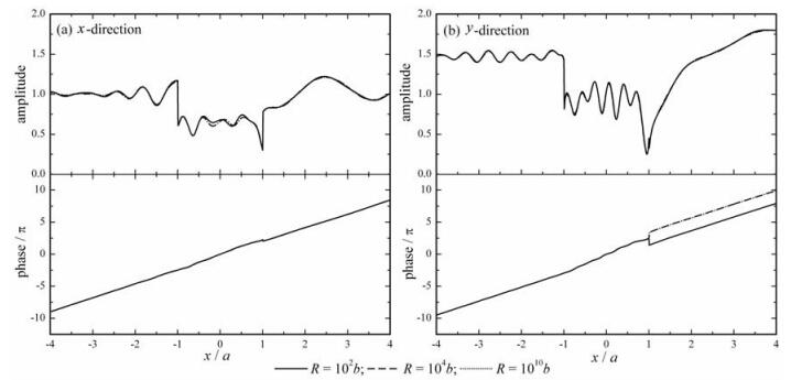在本文解析解的推导过程中,需用一半径非常大的圆弧近似模拟水平地表,如图 2所示.当大圆弧的半径R非常大时,所得解将趋近于真实解.图 6给出了大圆弧半径的选取对解的影响,其中谷地依然为V0-2,入射波频率η=2.0.可以看出,大圆弧半径R=104b的计算结果与R=1010b的计算结果非常接近,因此实际计算可取R=104b,其中b为谷地最外层圆弧边界的半径.