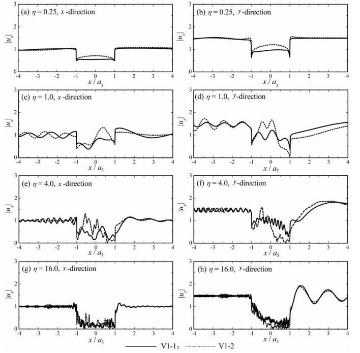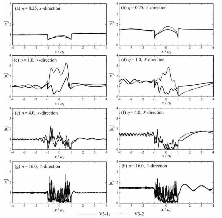 图 8给出了谷地中软弱夹层及其刚度的变化对地面运动的影响.其中谷地模型为表 1中的谷地V2-1、V2-2和V2-3,这三个谷地均为三层沉积,除第二个沉积层的力学参数外,它们其他的几何与力学性质完全一致.V2-1为正常沉积谷地,V2-2和V2-3为非正常沉积,第二个沉积层为软夹层,且V2-3软夹层的刚度低于V2-2软夹层的刚度,如表 1所示.如图 8所示,在低频波(η=0.25)入射下,地表位移幅值的变化有较为明显的规律:在地表中心地带,具有软夹层的谷地位移幅值较大,且软夹层刚度越小,地表位移幅值越大.在较高频波(η=1.0、4.0和16.0)入射下,地表位移变化复杂,较为明显的规律是,在地表软夹层出露部位,即0.6<|x/a3|<0.8,含有软夹层的谷地V2-2和V2-3的地表位移幅值明显高于正常沉积谷地V2-1的,且大部分情况下谷地V2-3的位移幅值高于V2-2的.这说明了谷地中的软夹层会吸收较多的散射波能量,从而造成其地表出露部位较高的地面运动幅值.