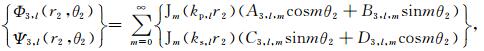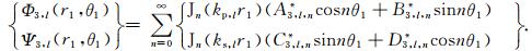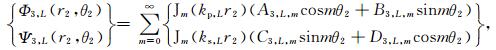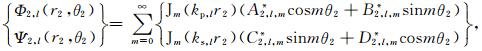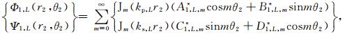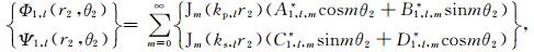 3.2 沉积介质中散射波的势函数如图 2所示,在第l层(l=0,1,…,L-1)沉积介质中存在三种散射波:小圆弧l外的柱面行波Φ1,L和Ψ1,L、小圆弧l+1内的柱面驻波Φ2,l和Ψ2,l、以及大圆弧内的柱面驻波Φ3,L和Ψ3,l.当l=0时,上述柱面行波不存在,Φ1,0=Ψ1,0=0,即在最表层的沉积介质中只有两种柱面驻波,如图 2所示.在极坐标系r1-θ1和r2-θ2下,上述散射波的势函数具有如下表达式