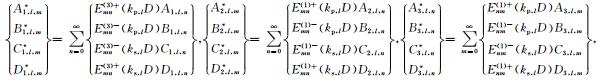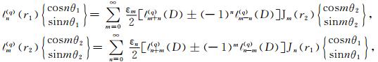 其中,函数Hn(1)(x)和Jn(x)分别表示第一类Hankel函数(即第三类Bessel函数)和第一类Bessel函数,A1,L,n至D3,L,m为未知的待定系数.利用如下内域型Graf加法公式[15]