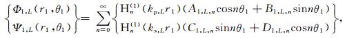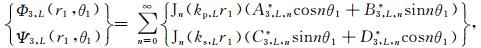 如图 2所示,半空间中由于沉积谷地的存在而产生的散射波包括圆弧L处由O1点向外辐射的柱面行波Φ1,L和Ψ1,L、以及模拟水平地表的大圆弧内的柱面驻波Φ3,L和Ψ3,L,在极坐标系r1-θ1和r2-θ2下,它们分别具有如下Fourier-Bessel级数形式: