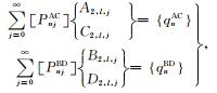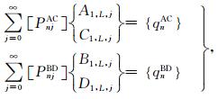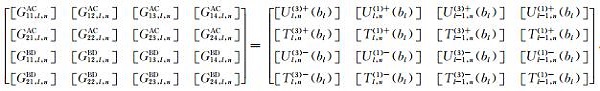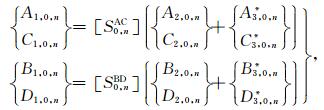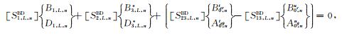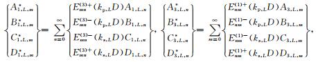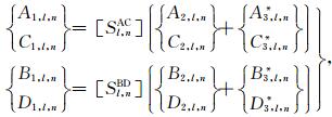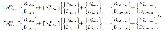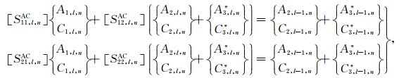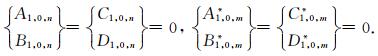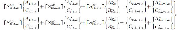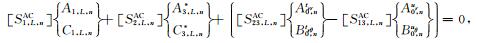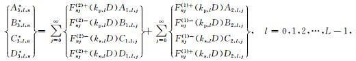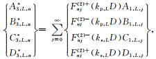 之后,将(33a)式代入(41)式可得如下关于待定系数对A2,l,j和C2,l,j以及系数对B2,l,j和D2,l,j的方程组
