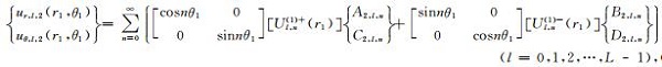 在极坐标系r1-θ1下,与势函数对Φ1,L和Ψ1,L、Φ2,l和Ψ2,l、以及Φ3,L和Ψ3,l对应的位移和应力可表示为
