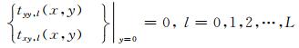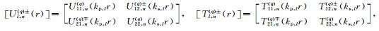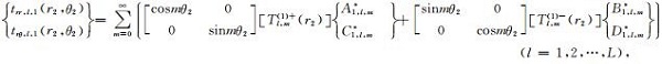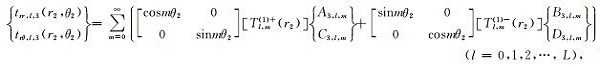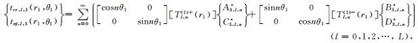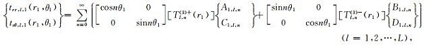 其中,tyy,l和txy,l分别表示直角坐标系下第l层介质中的正应力和剪应力,ur,l和uθ,l分别表示极坐标系下第l层介质中的法向位移和切向位移,trr,l和trθ,l分别表示极坐标系下第l层介质中的法向正应力和切向剪应力.