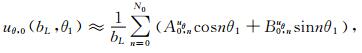 此外,与(8)式给出的自由场波的势函数对应的位移场与应力场在圆弧边界r1=bL上可近似表示为如下有限Fourier级数: