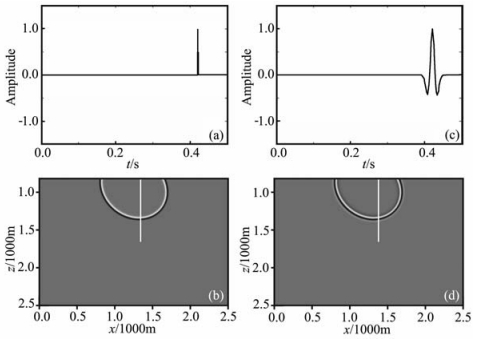 图 4 (a)点脉冲;(b)脉冲(a)的VSP逆时偏移响应;(c)30Hz的雷克子波;(d)雷克子波(c)的VSP逆时偏移响应 Fig. 4 (a) Apulsefunction; (b) VSP RTM impulse response to a pulse function; (c) 30 Hz Ricker wavelet; (d) VSP RTM impulse response to Ricker wavelet |
