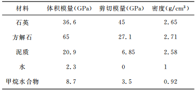 应用2.1节所述模型原理,我们对水合物藏饱和度如何影响时移地震进行了模拟分析.建模所采用的含甲烷水合物沉积物的岩石物理模型有二.模型A:甲烷水合物充填在孔隙中,计算中把甲烷水合物看作为孔隙流体的一部分;模型B:甲烷水合物附在固体表面成为固体的一部分,计算中看作作为固体骨架的一部分.模型中混合样品中甲烷水合物和水所占据体积为孔隙体积空间,各种材料的物性见表 1[35, 36].