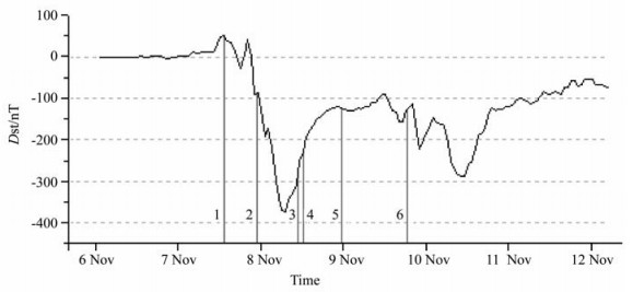 图 3 2004年11月磁暴期间的Dst指数(垂直线段标识图 4~9中的ENA图像的观测时间) Fig. 3 Dst index during storm of Nov, 2004, with vertical lines marking the times when the ENA images in Figs.4~9 were recorded |