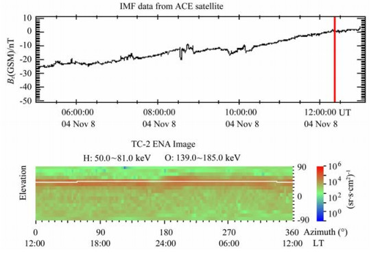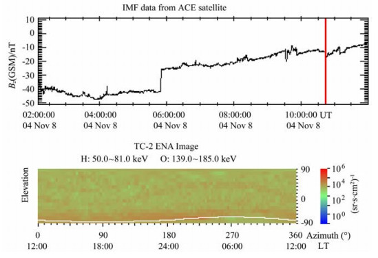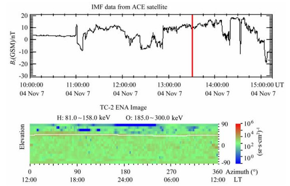 图 4 经过传输时间校正的IMFBz分量(上)和2004年11月7日13:30UT的ENA图像(下,观测时间以红色垂直线标注) Fig. 4 The IMF Bz component (top, corrected for the solar wind travel time from the ACE position to the Earth) with a vertical red line marking the time (13:30 UT on 7 Nov, 2004) when the ENA image (bottom) was recorded |