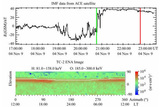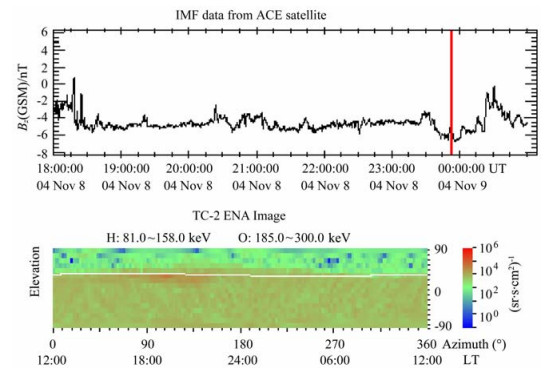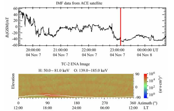 图 5 经过传输时间校正的IMFBz分量(上)和2004年11月7日23:05UT的ENA图像(下,观测时间以红色垂直线标注) Fig. 5 The IMF Bz component (top, corrected for the solar wind travel time from the ACE position to the Earth) with a vertical red line marking the time (23:05 UT on Nov 7, 2004) when the ENA image (bottom) was recorded |
