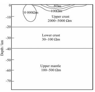 对于上地壳地层,主要属花岗质岩,基本由劣导电性的矿物成份组成;在相应的深度范围内,压力的影响使地层变得越加致密,因而通常为高电阻率特征,大约在2000~5000 Ωm之间.而中、下地壳的物质主要属花岗闪长-闪长质和玄武质岩,同样属于劣导电性矿物成份;但其相应的深度范围大于20 km,温度大约在300~400℃°之间,在构造活动区或年轻的岛弧区一般远高于这一温度.因此,在许多区域,由于高温的作用使下地壳通常表现为低电阻率特征,一般为30~100 Ωm,而在活动构造区,电阻率更低.由于下地壳低阻层的存在,可能使得利用大地电磁测深数据确定上地幔电阻率变得较为困难,但是在下地壳低阻层相对缺失的地区,上地幔的电阻率则比较容易估计,大致在100~500 Ωm[13].