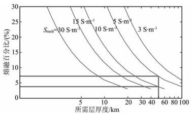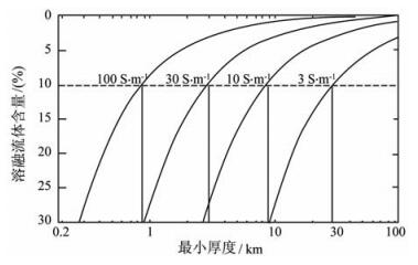 图 6 产生15000 S电导的熔融流体百分含量、熔融层最小厚度及电导率的关系 Fig. 6 The relationship of fluids volume fraction, minimum thickness and conductivity capable to produce a conductivity of 15000 S |