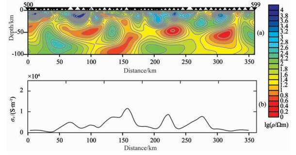图 5 500线剖面电阻率模型(a)及纵向电导(σv)剖面(b) Fig. 5 Resistivity model (a) and vertical conductivity (b) of profile line 500 |