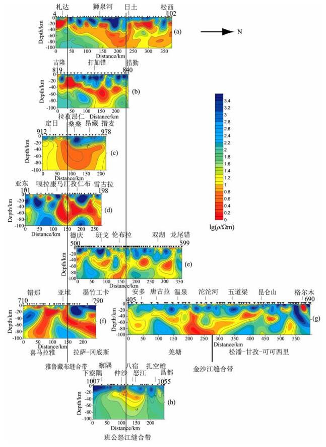根据大地电磁探测获得的电性结构分析,从西至东各条剖面上普遍存在的低阻通道就是雅鲁藏布江缝合带和班公-怒江缝合带.雅鲁藏布江缝合带附近的低阻体虽然规模不大,但无论是高原西部还是东部的电阻率剖面上,都有低阻体存在.所有穿越班公-怒江缝合带的电性结构均表明,在班公-怒江缝合带及其南侧,存在大规模的低阻体,该低阻体从西到东连续分布,且向下均有延伸至上地幔的趋势.在藏北600号剖面的金沙江缝合带附近,也发现有大规模的中下地壳低阻体,但由于在金沙江缝合带的其他位置没有布置大地电磁剖面,我们无法确定该低阻体是否也具有东西向的连续性.