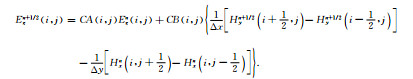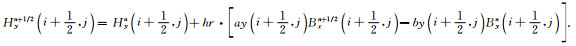 以上式(4)~(6)可用于子时间步n→n+1/2电磁场的时域推时计算,其中式(4)在计算n+1/2时刻场值时其右端只涉及n时刻场值,称为显式格式,但(5)式和(6)式都包含同时刻Ezn+1/2和Hyn+1/2场分量,不能构成显式时间推进计算,逻辑上讲时间步进是无法完成的,称为隐式格式.为克服此困难,重写(5)式,并把它代入到(6)式消去Hyn+1/2,得