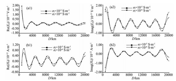 图 5 电离层电导率取不同值时电磁场的比较图 Fig. 5 Comparison for electromagnetic fields for the different conductivity of ionosphere |