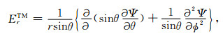 上面方程中,电场和磁场相互耦合,无法直接求解,将电磁场沿着地球径向方向分解为两种情形:(一)电场存在径向分量,磁场无径分量,即所谓的横磁场,记为TM;(二)电场无径向分量,磁场存在径向分量,所谓的横电场,记为TE.引入电磁场的Debye势Φ、Ψ[7, 12],由(1)~(7)式及电磁场切向分量连续的边界条件导出Φ、Ψ所满足的方程及边界条件如下: