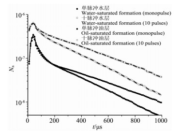 由此可以看出,相隔一定时间间隔的多脉冲发射中子后总的热中子计数仍然按照单脉冲满足的指数规律衰减,多脉冲重复发射中子对测量地层热中子寿命时热中子的总计数起累积作用,从而也增加了热中子时间谱的道计数,对利用热中子时间谱获取地层宏观俘获截面进而确定地层含油饱和度是有利的.