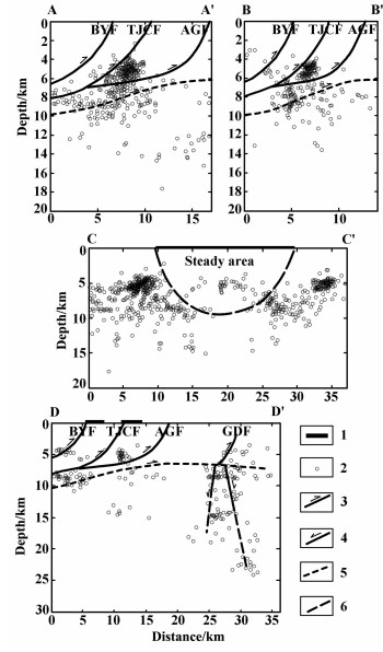 4.1.2 震源深度分布特征水库蓄水后的震源深度统计结果显示,研究区范围内约占70%的小震震源深度分布在4~10km,10~25km也有少量地震发生,并且震源深度分布有一定的连续性.相对比水库蓄水前震源深度分布的特征,蓄水后小震震源分布似乎显示出从深部向浅部迁移的趋势,这一变化可能与水库蓄水有关.为便于寻找震源深度分布与地下断裂构造展布的关系,我们横跨几个地震丛集区分别作了震源深度剖面A-A′、B-B′、C-C′、D-D′(剖面位置见图 3a),将剖面两侧各4km范围内的震源位置垂直投影到剖面上,同时,将主要断裂构造也投影到剖面上(图 5).