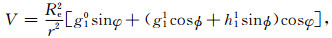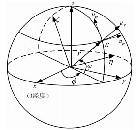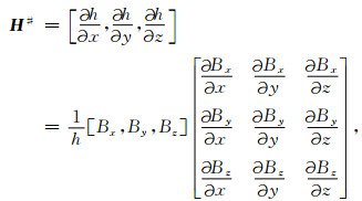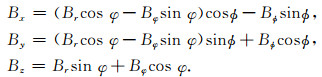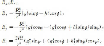 其中,g10,g11,h11为高斯系数,φ为地心经度.求(16)式在三个方向上的偏导数就可以得到地磁场在纬度方向、经度方向、径向方向三个方向上的分量Bφ、Bφ、Br: