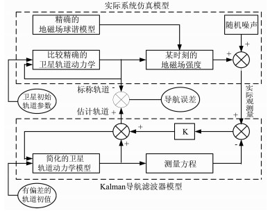 地磁场自主导航系统的仿真系统有两部分组成:第一部分为实际系统的仿真模型,第二部分为导航滤波器设计.实际系统的仿真模型是对卫星运行的实际环境进行模拟,包括卫星的轨道运动方程、空间环境的影响以及测量系统的性能等,用于基本数据准备.导航滤波器模型则用于对采用的自主导航方法进行仿真分析.导航系统的仿真结构图如图 2所示.