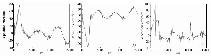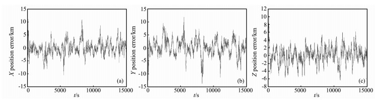 假设卫星对地姿态稳定,状态方程采用式(10),观测方程采用式(22),滤波周期T=1s,仿真时间为15000s,仿真的结果如图 5、6.
